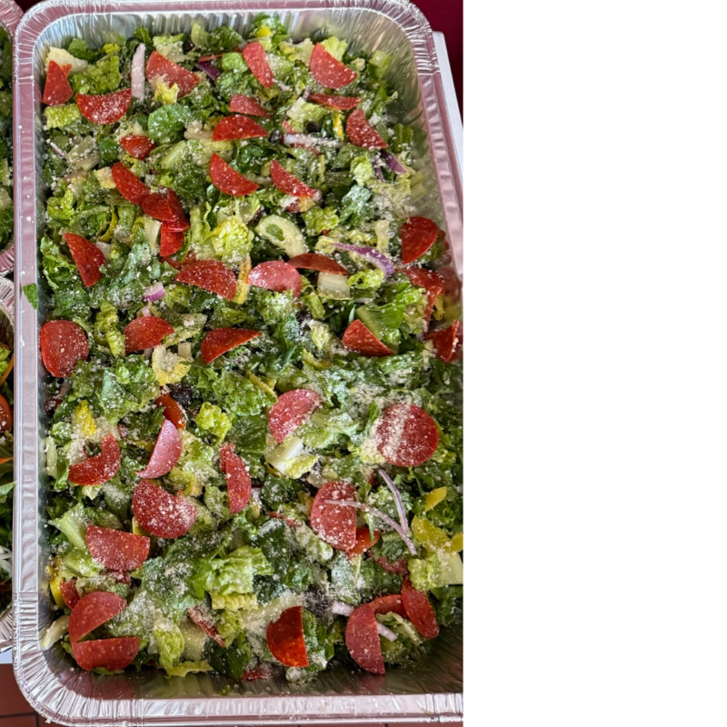 Pepperoni, pepperoncini, lettuce, tomatoes, cucumbers, onions, black olives, parmesan cheese & Italian dressing